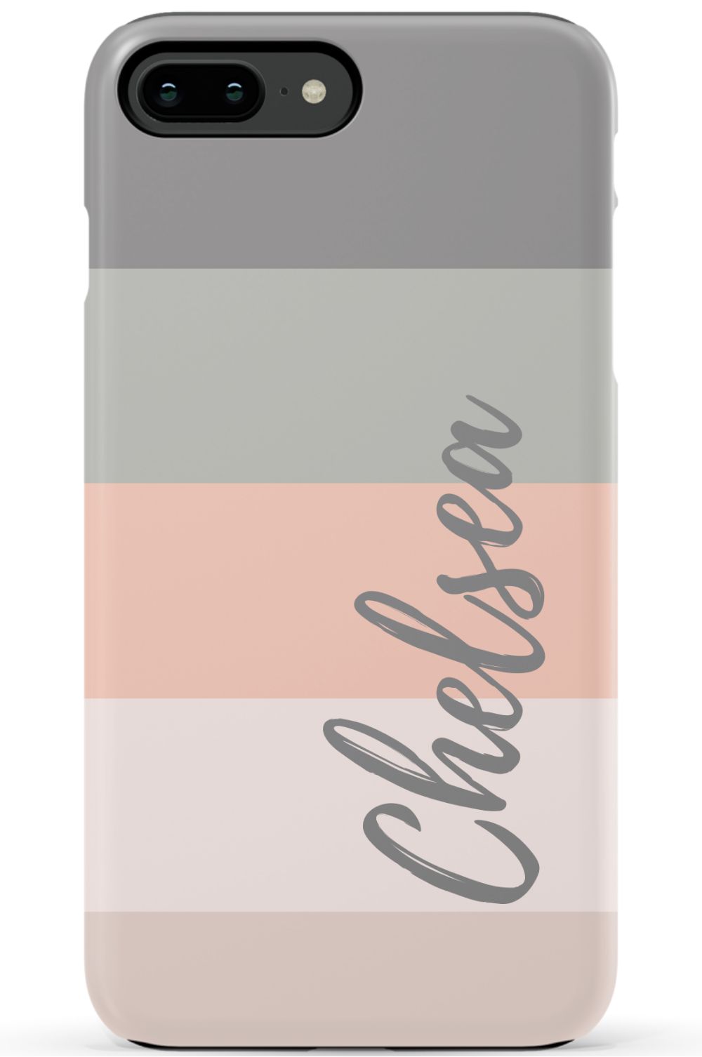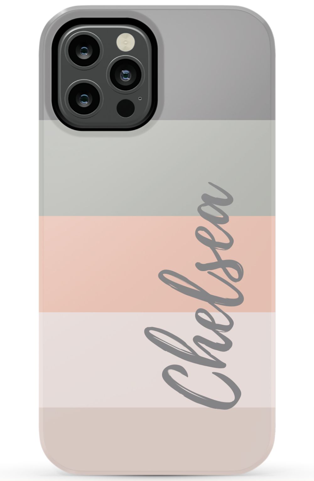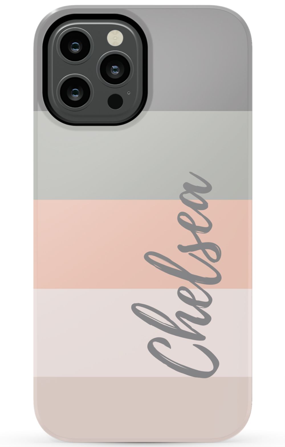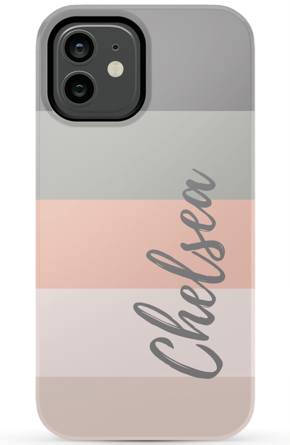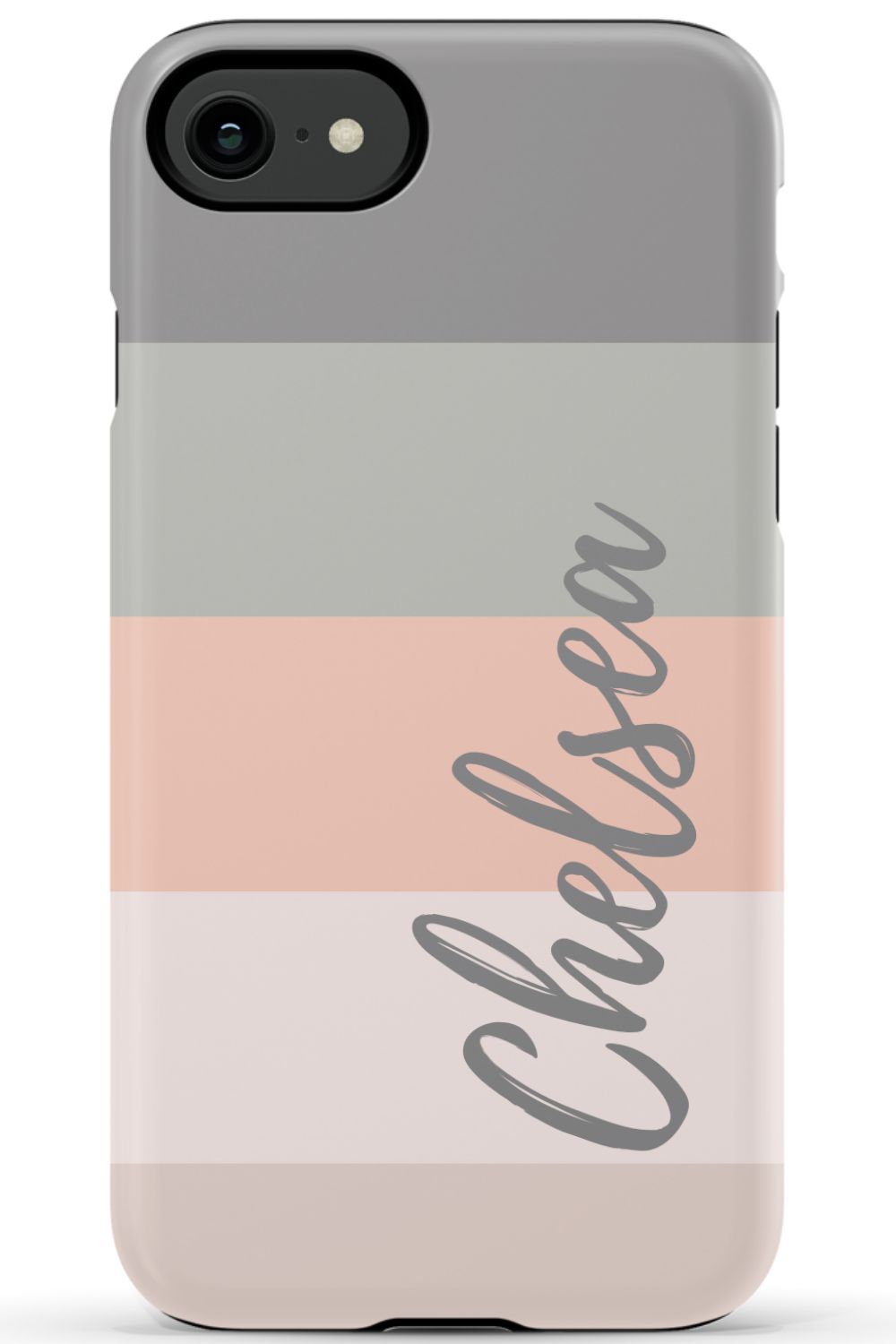 Line up and fall in love. A colorblocked ombre stripe stack in soft hues of coral, gray and beige is prettily presented on this customizable phone case.