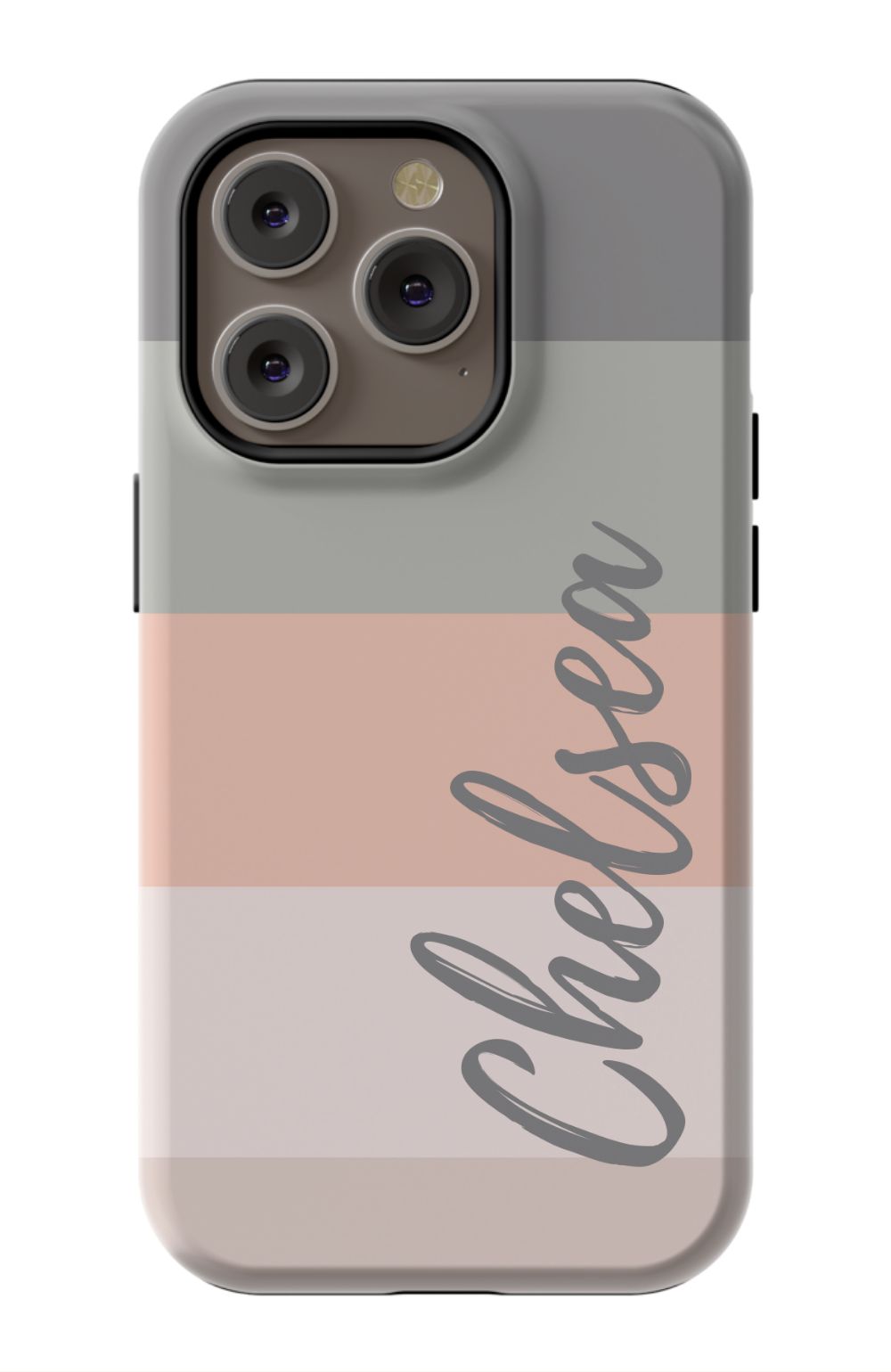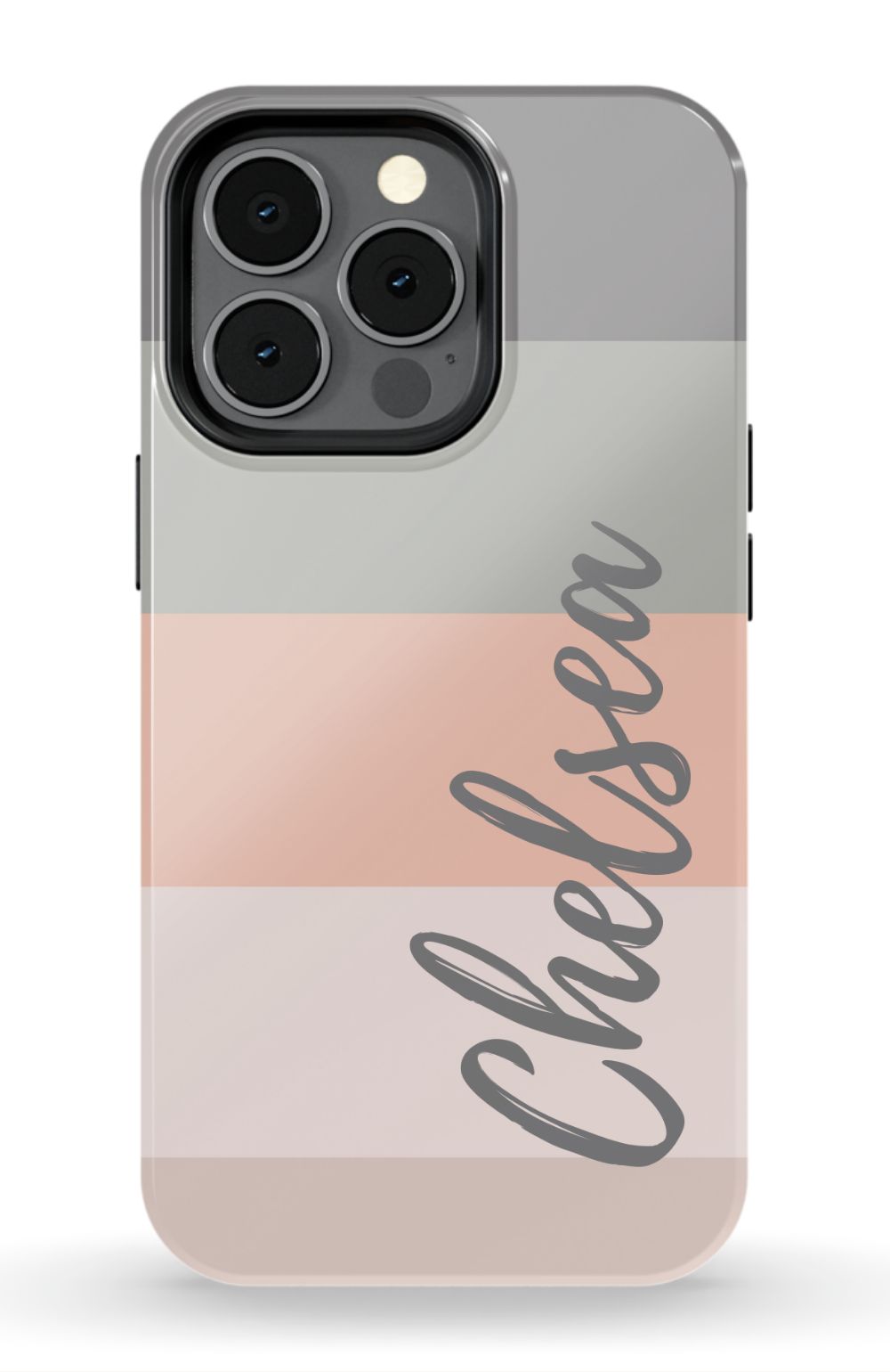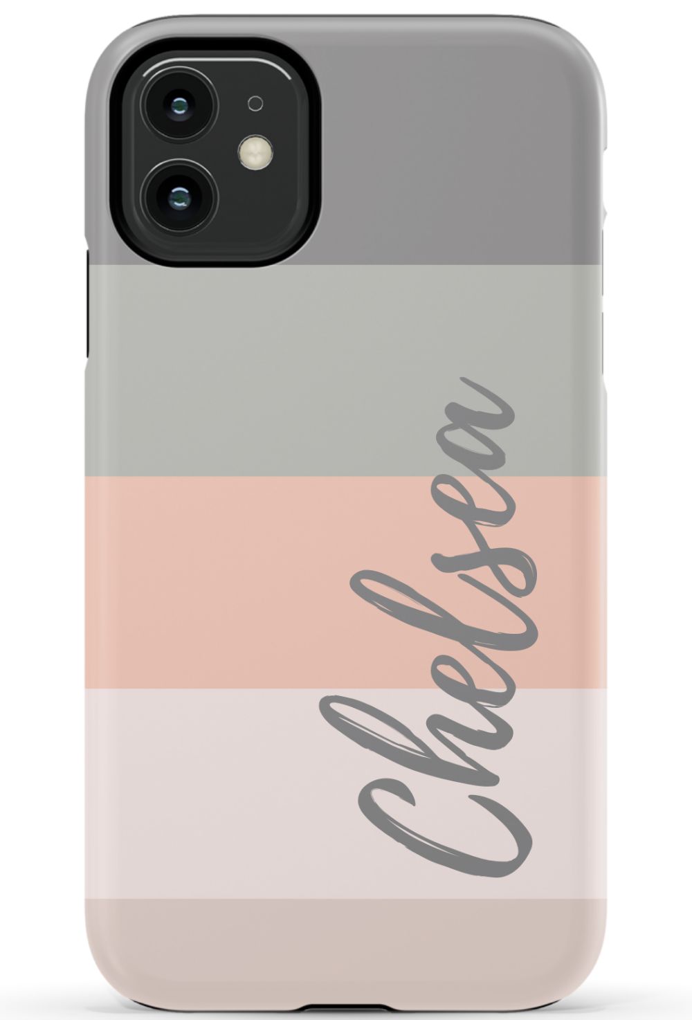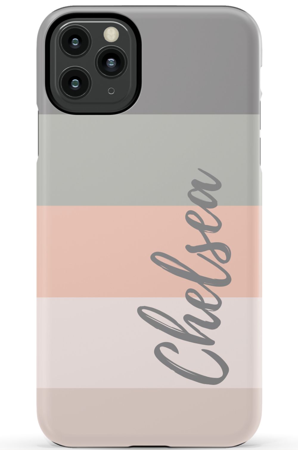 Line up and fall in love. A colorblocked ombre stripe stack in soft hues of coral, gray and beige is prettily presented on this customizable phone case.