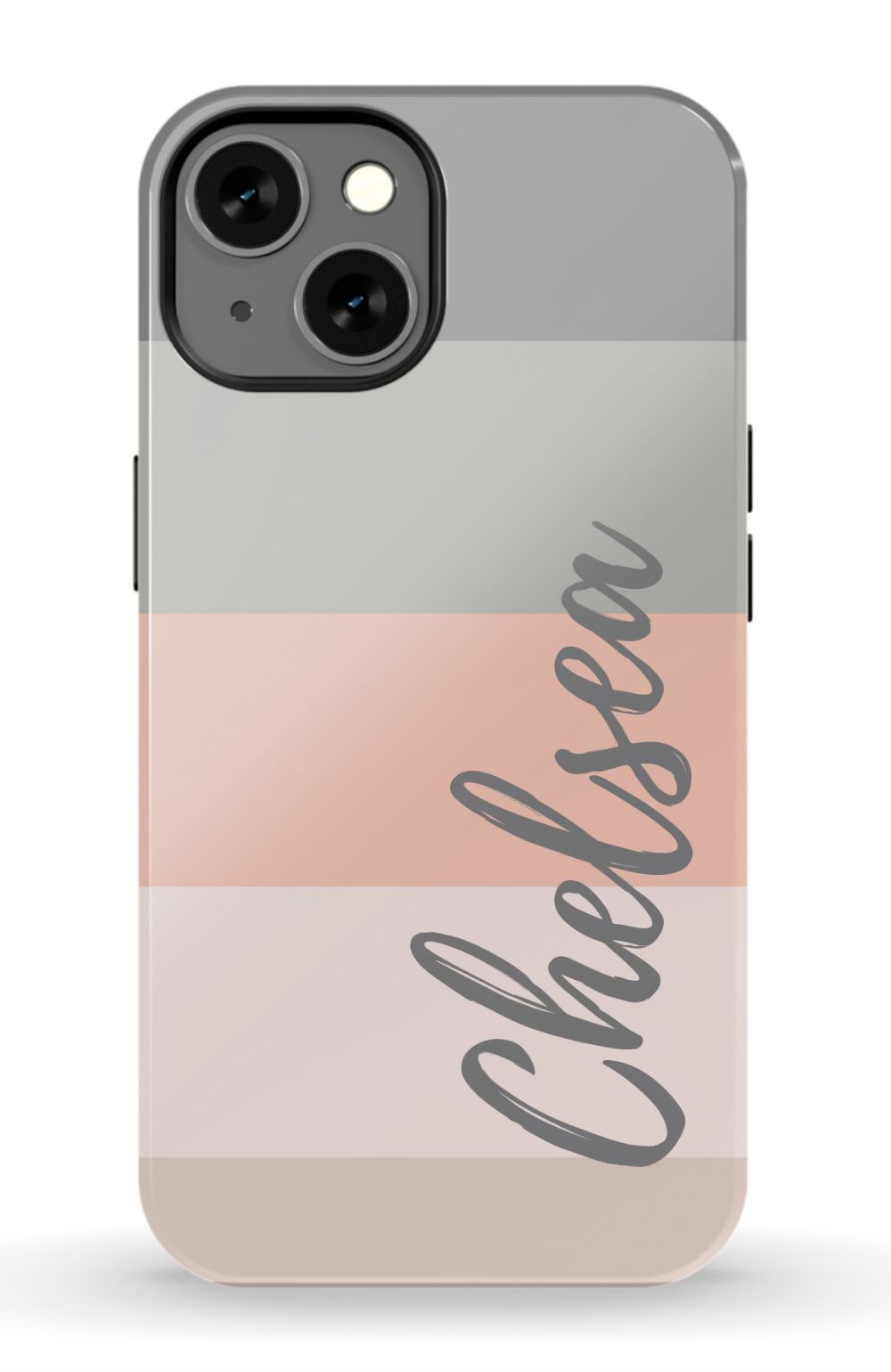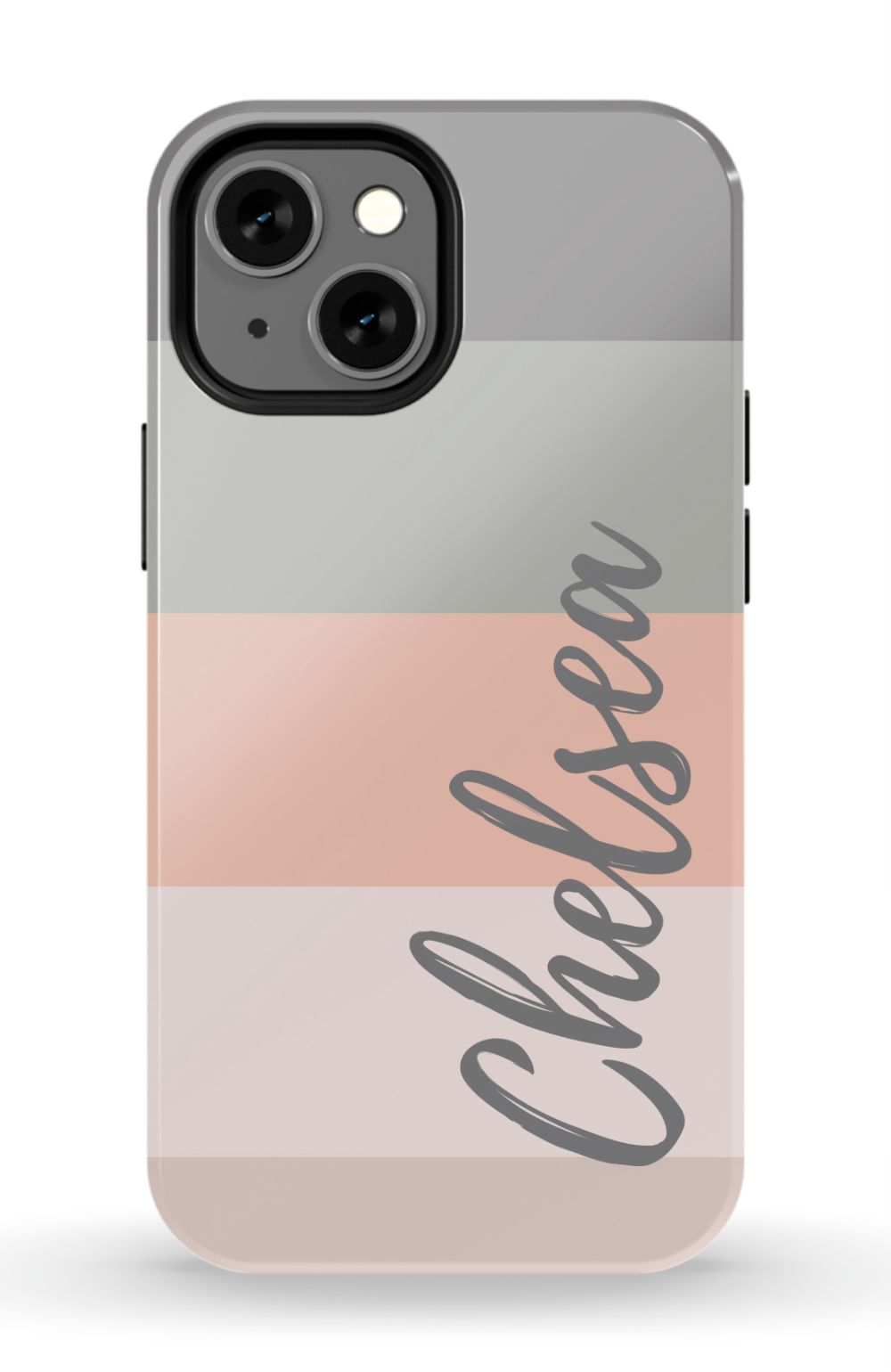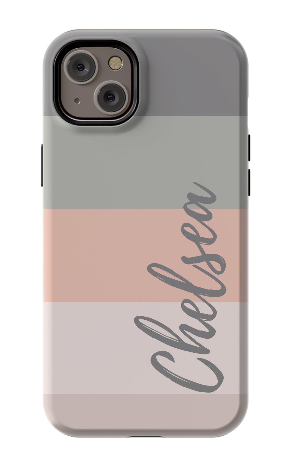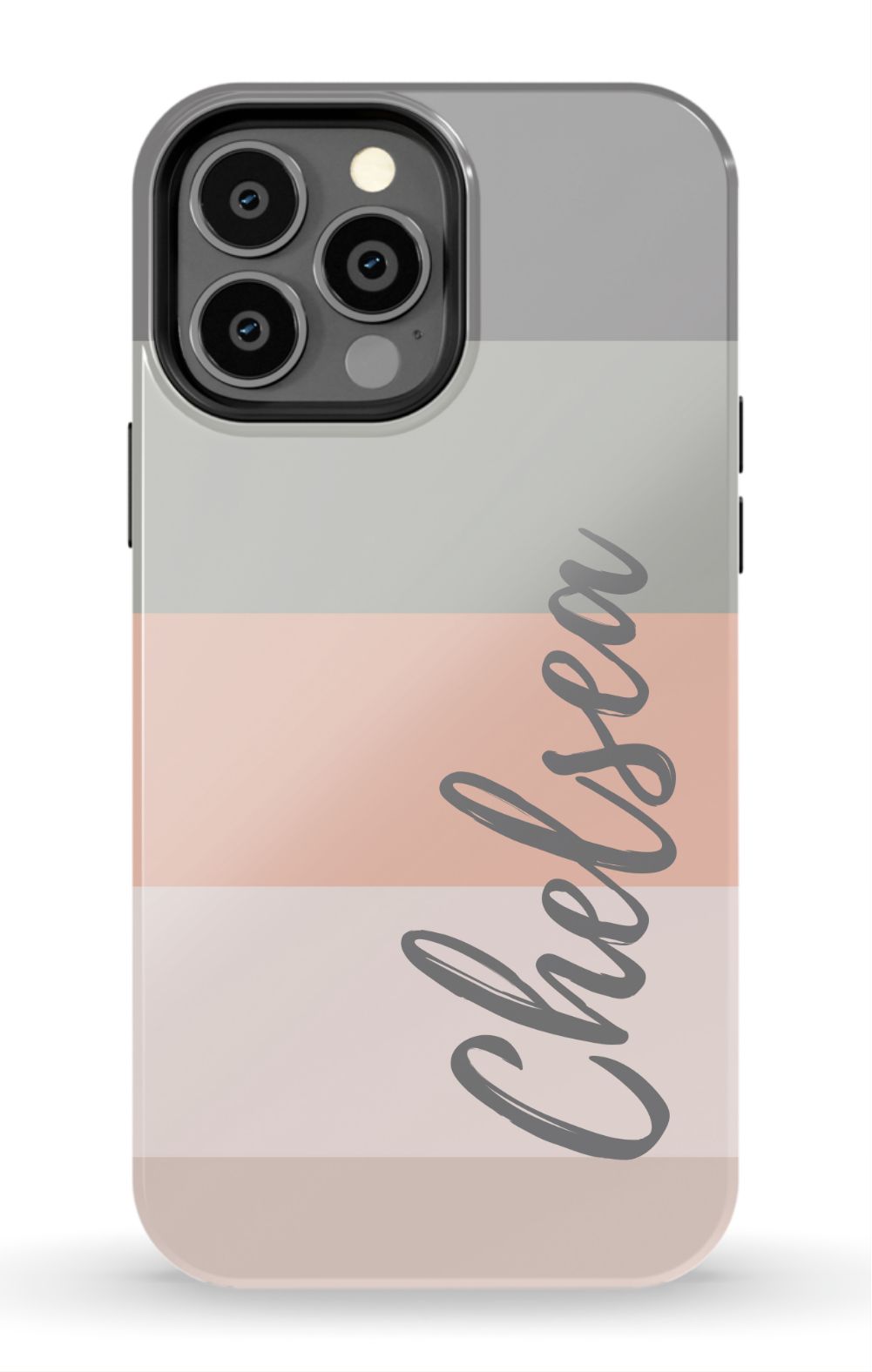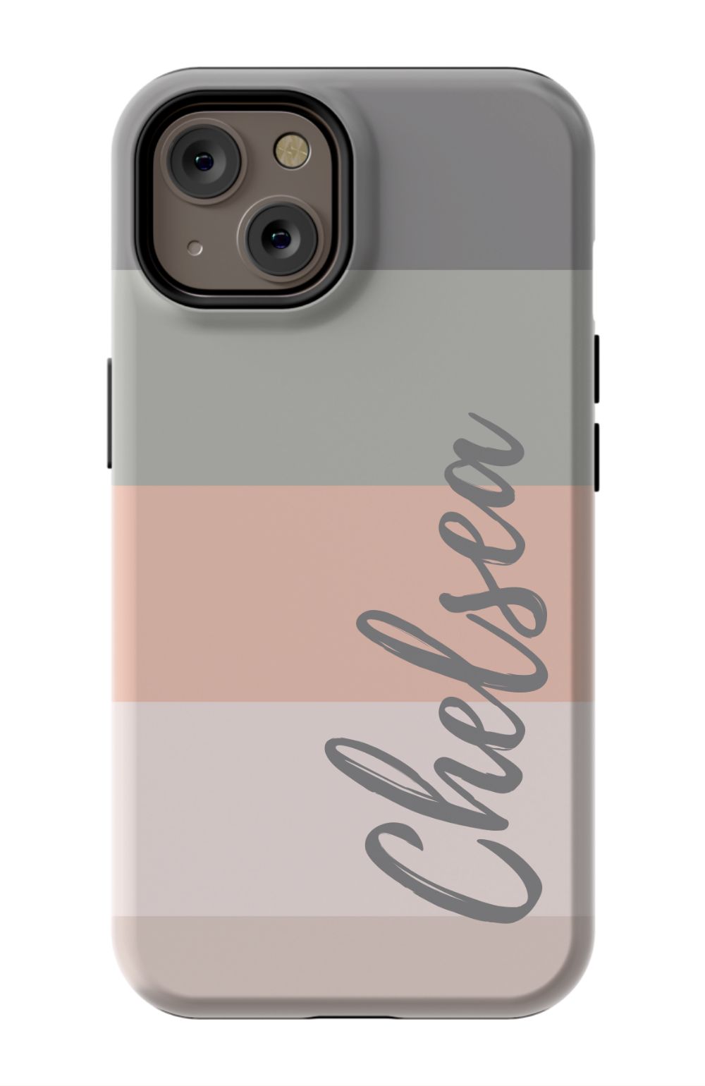 Line up and fall in love. A colorblocked ombre stripe stack in soft hues of coral, gray and beige is prettily presented on this customizable phone case.